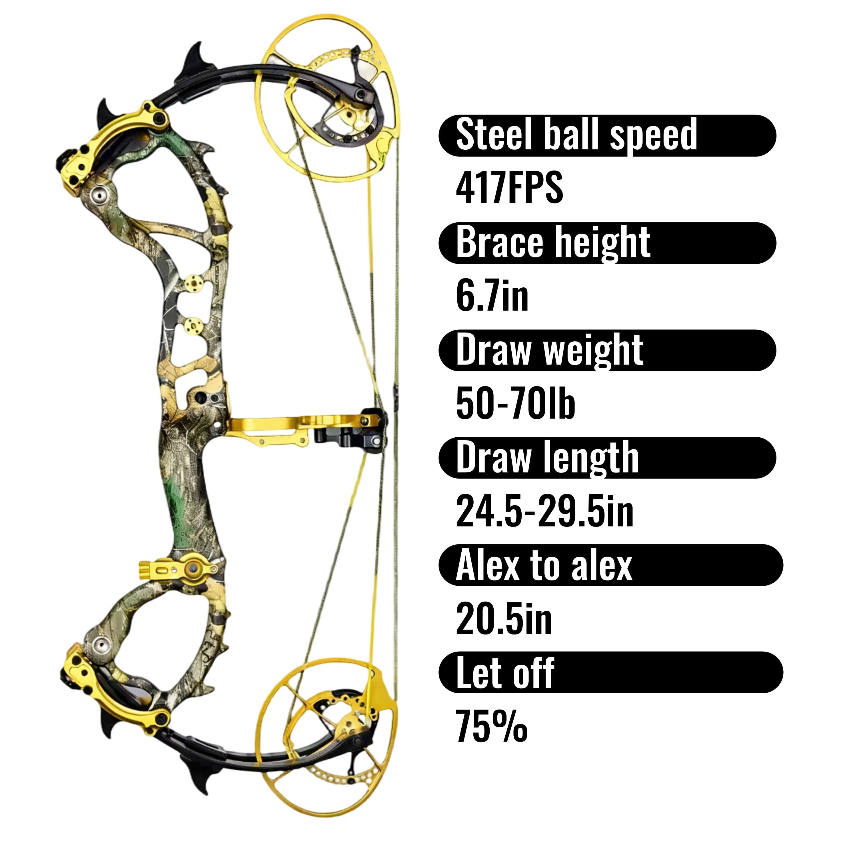 Enjoy a 75% let-off at full draw, significantly reducing holding weight and allowing for steady aiming with less fatigue. Perfect for extended practice sessions or long hunting trips.