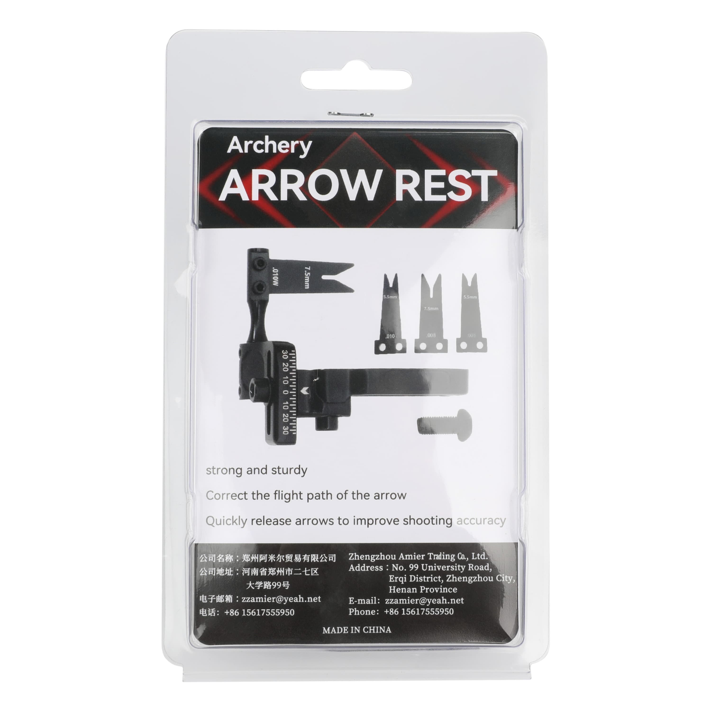 Package Includes 1 x Arrow Rest, 3 x Spare Blades, 1 x Mounting Screw, 1 x Allen Key