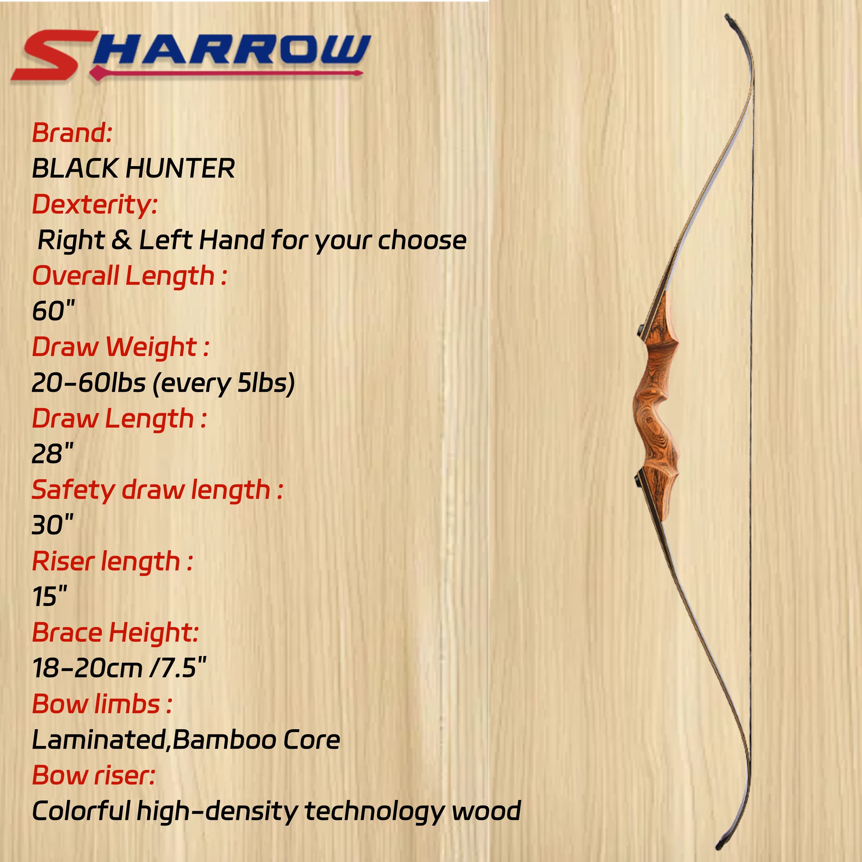 Black Hunter Wooden Takedown Recurve Bow 20-60lbs RH/LH