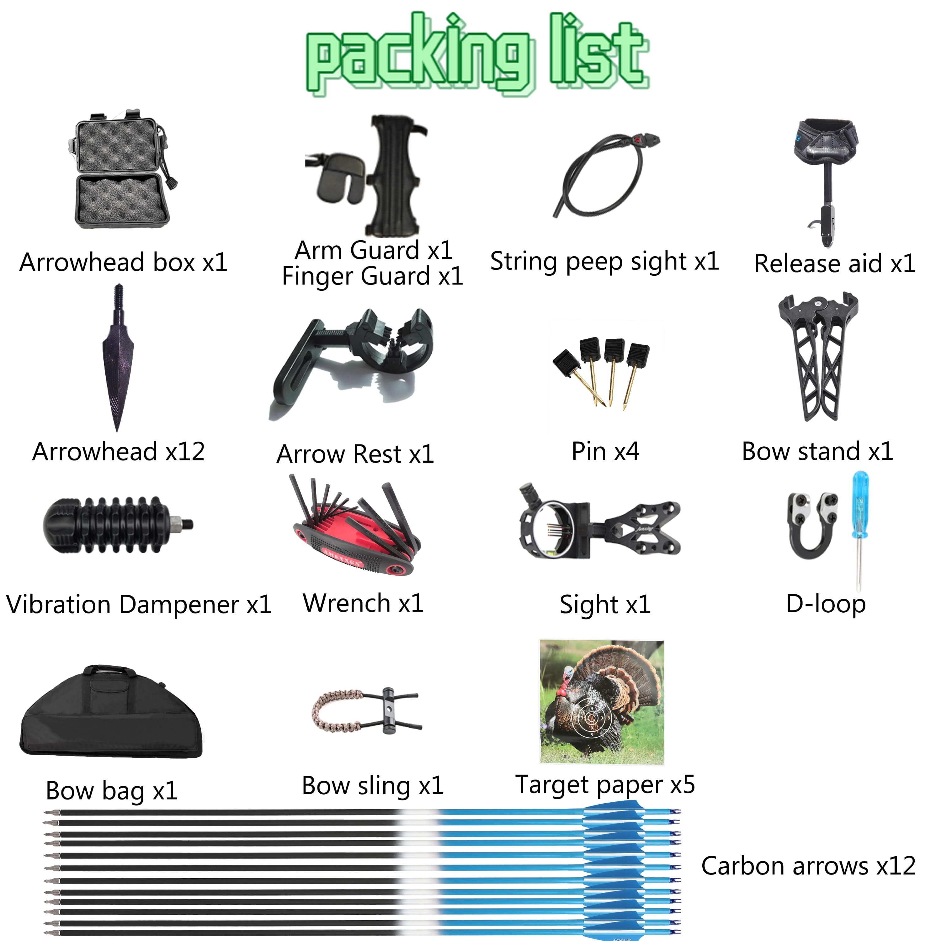 • Includes 12 carbon arrows and complete accessory set