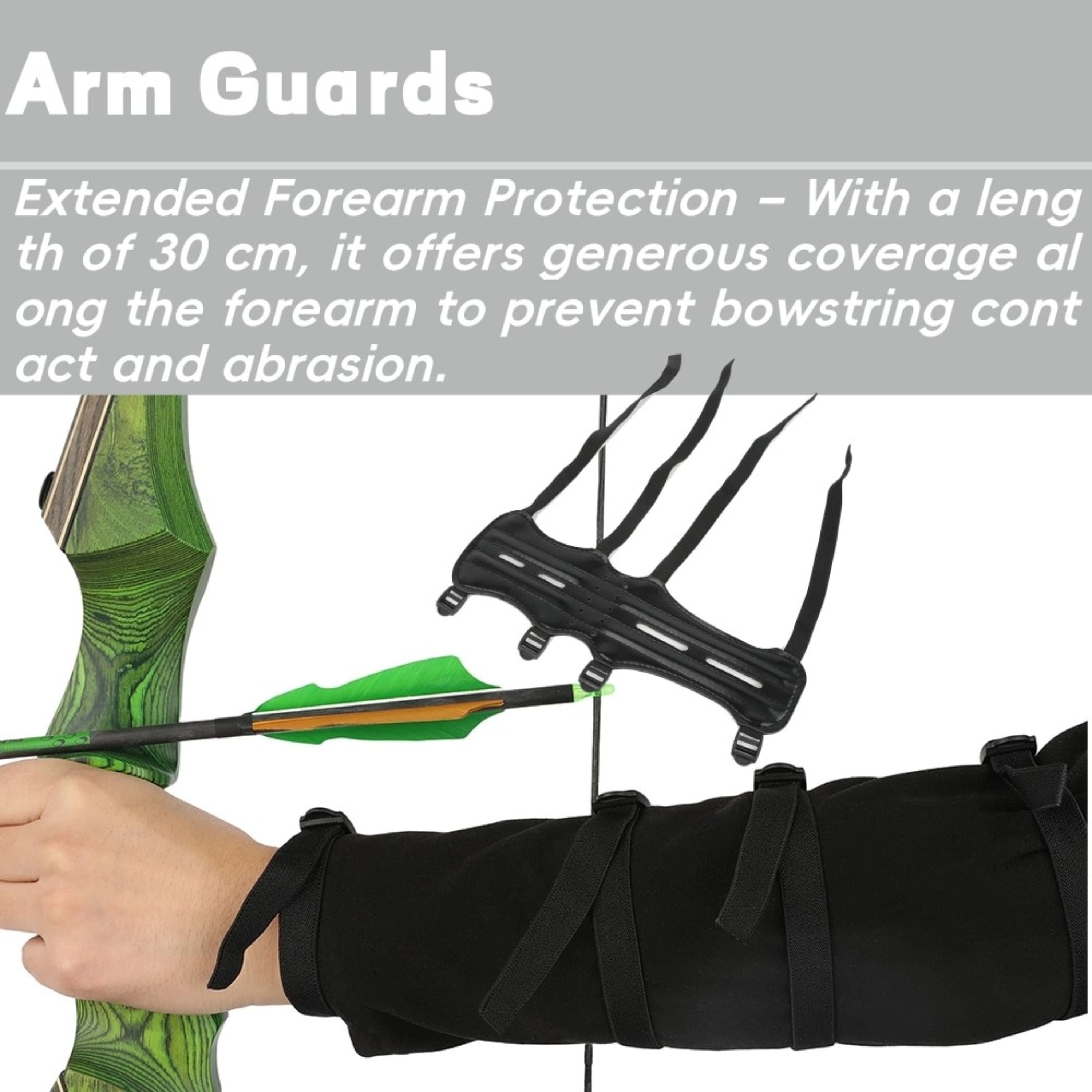 • Full-Length Protection: With extended dimensions of 30cm in length, this armguard provides comprehensive coverage of the forearm, effectively shielding against bowstring slaps and accidental impacts during practice or competition.